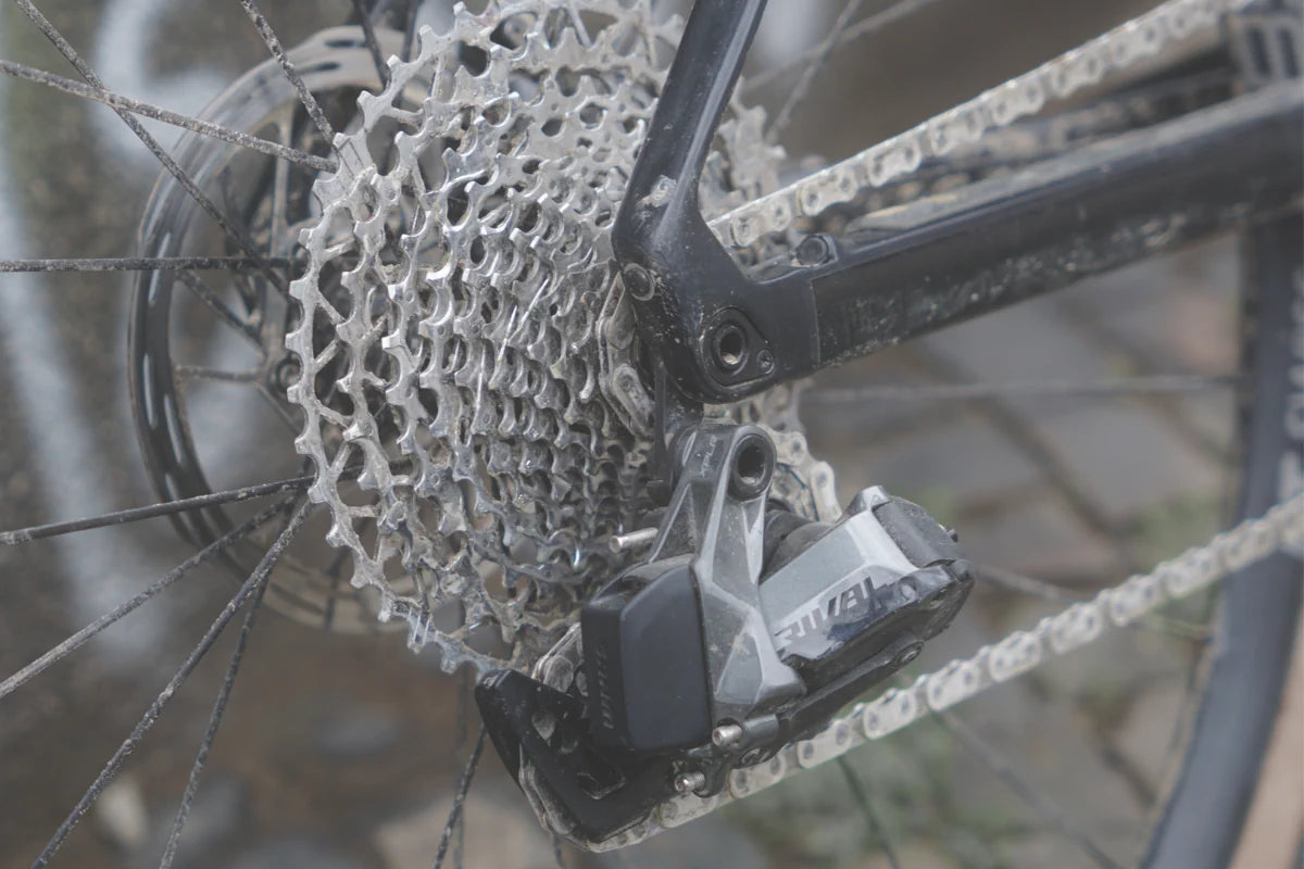 Hier eine moderne SRAM RIVAL Schaltung auf einem Gravelbike nach einer vierstündigen (Tor)Tour durch Matsch, Schlamm und Pfützen. Das Rad ist dreckig, der Antrieb hat ebenfalls viel abbekommen, aber das Kettenwachs hat so gut wie den ganzen Dreck abfallen lassen. Natürlich darf das gute Stück nach so einer Fahrt auch gesäubert und neu gewachst werden - aber das REEEM Kettenwachs hat hier seinen Job getan!
